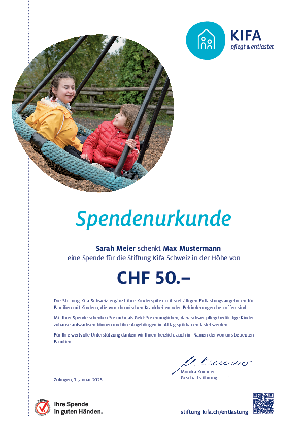Mit einer Spendenurkunde entscheiden Sie sich für ein sinnstiftendes Geschenk, das Familien mit schwer pflegebedürftigen Kindern Zeit, Entlastung und Normalität im Alltag ermöglicht.