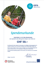 - Alternativ können Sie auch per Einzahlungsschein bezahlen. Senden Sie uns dazu eine Email an spendenextra@stiftung-kifa.ch mit den unter Punkt 3 genannten Angaben, dem gewünschten Betrag und dem Betreff: Spendenurkunde.