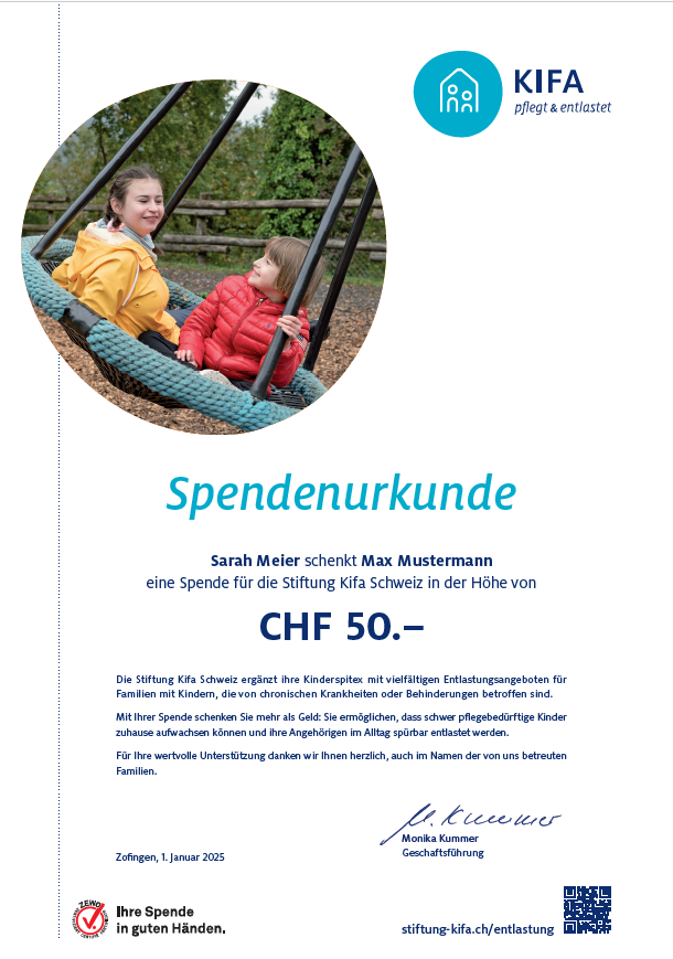 Mit einer persönlichen Spendenurkunde der Kifa verschenken Sie mehr als Geld. Sie schenken Familien mit schwer pflegebedürftigen Kindern das Kostbarste überhaupt: Zeit, Entlastung und ein wenig Normalität im herausfordernden Alltag.